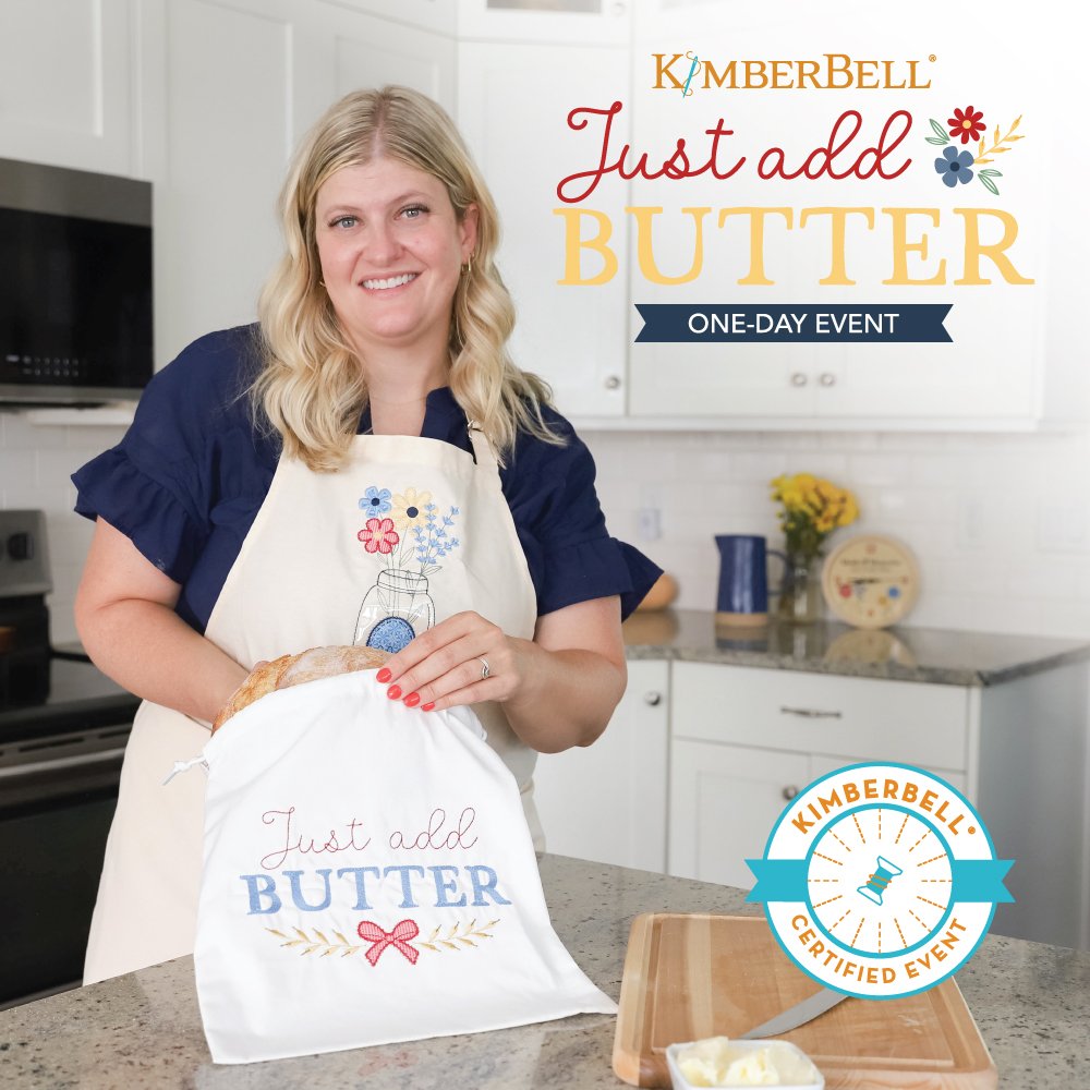 At our Kimberbell one-day machine embroidery event, you’ll make three functional projects with a cottagecore feel: the Meals & Memories Clock, the Just Add Butter Cinch Sack, and a Mason Jar Bouquet Gathering Apron with roomy pockets! With a variety of fresh techniques, Just Add Butter is your recipe for fun.